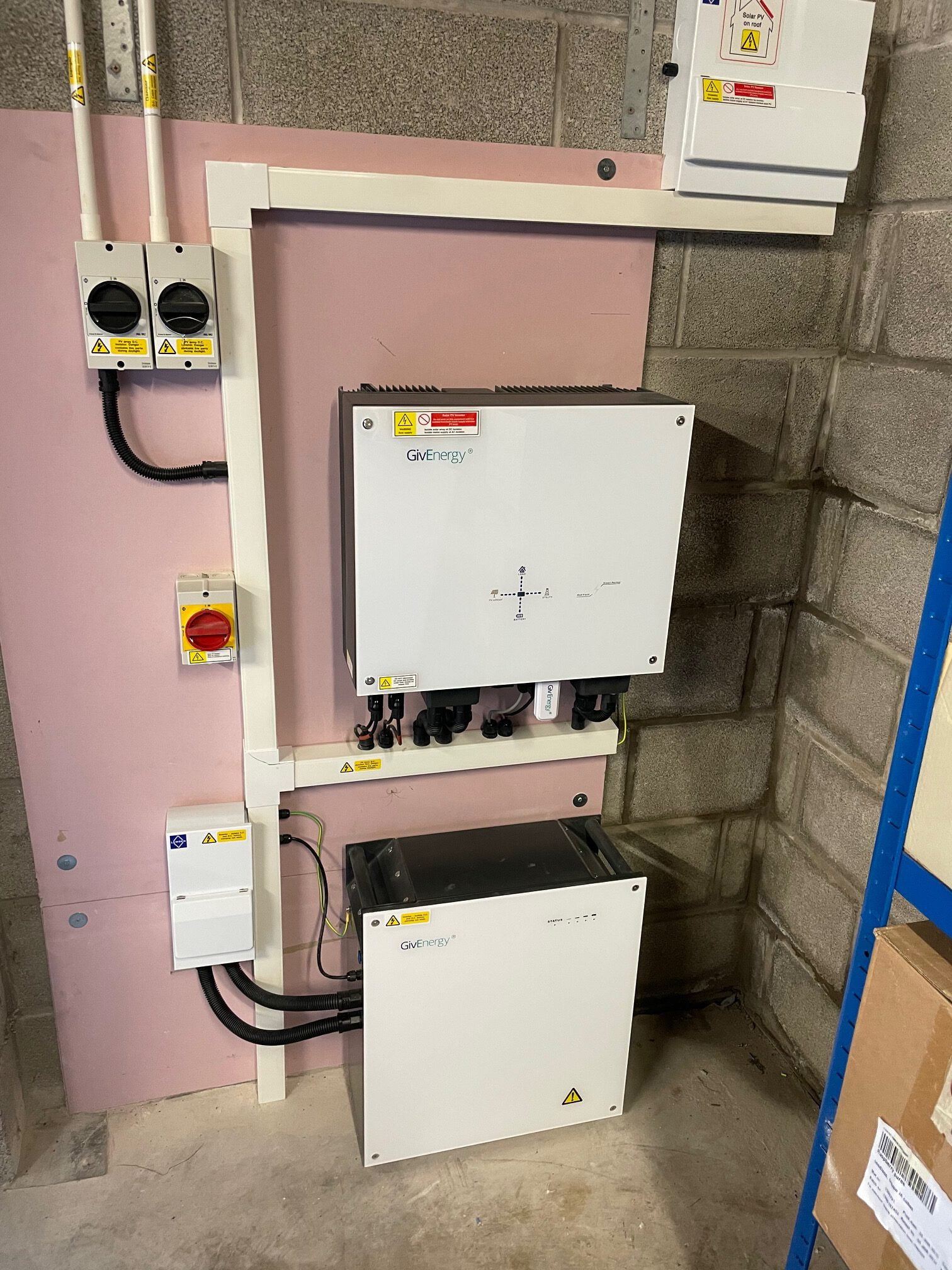 We’ve fitted an AC Coupled inverter and a 5.2 kW battery storage device which is linked to the house electrics and the new EV Charge point, this saves the customer money and uses the car battery to store even more electric which is generated.
